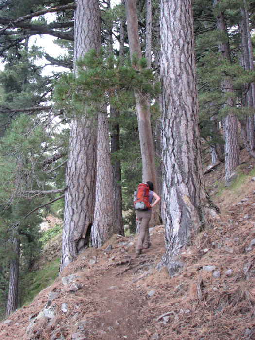 Odată trecuți de Vizzavona suntem pe GR20 sud, mai puțin înalt și mai accesibil, lucru pe care-l simțim căci pentru prima dată nu ne poticnim în bolovani, reușind să prindem viteză. În scurt timp ajungem la firul unei văi dincolo de care întâlnim o stână cu frumoase clădiri din piatră. Poteca ține versantul la altitudini între 1500 și 1600 de metri, ceea ce înseamnă că mergem prin pădure. Față de zilele trecute peisajul este complet schimbat. Adeseori întâlnim în drumul nostru pini uriași cum nu am mai văzut încă, ce mă duc cu gândul la vremurile de demult când din aceștia se făceau catargele marilor corăbii. Peisajul nu mai e alpin, dar ne place și mereu ne trezim gândindu-ne la recent citita carte a lui Bill Bryson, ”O plimbare prin pădure„, în care descrie experiența sa pe Appalachian Trail, un traseu de aproape 3400 de kilometri dealungul munților Apalași. Poteca facilă, fără diferențe de nivel semnificative ne permite o viteză mare, însă cu toate acestea ajungem la șosea și apoi la refugiul Capanelle după mai bine de patru ore jumate. Inițial credeam că timpul standard pentru această etapă e de patru ore, ceea ce ne-ar fi știrbit serios stima de sine însă când consultăm însemnările descoperim că în realitate e de cinci ore și jumătate: așa mai merge.