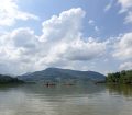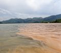 O vale venind din Bosnia confluează cu lacul aducându-și prinosul de ape. Ploaia puternică din cursul nopții pare să fi făcut ravagii sau poate există minerit prin zonă, cert este că apele bosniece sunt iritate și nu vor să-și împartă jucăriile cu Drina astfel că lacul e bicolor: pe stânga roșcat-portocaliu, pe dreapta maro-verzui. Mă fascinează granița de ape, aproape netă, materială. Încerc să o stric răvășind-o cu padela și parcă simt în nări mirosul argilei. În această porțiune avem de parcurs dintr-un capăt în altul un lac cu lungimea de patru kilometri, așa că am timp să observ capriciile apei, ba mai mult, la un moment dat se pornește un vânt puternic din față ce ne obligă să luăm valurile în răspăr. Caiacul meu Rotomod are fundul plat chiar până în prova ceea ce face să nu taie valurile ci să le pălmuiască ridicând jerbe de stropi pe care vântul mi le aruncă apoi în față. Vântul cade la fel de brusc pe cum a și început și în final toată dezlănțuirea de forțe pare o biată furtună într-un pahar cu apă.